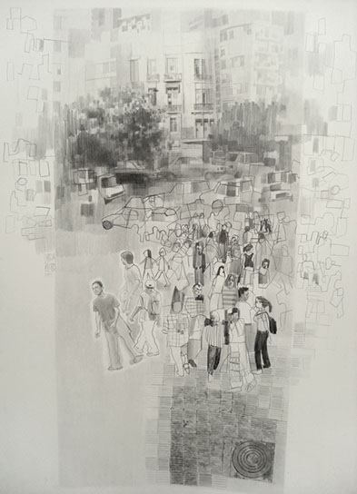 Woman with child on the sidewalk, graphite pencil on paper, 70 x 50cm, 2009