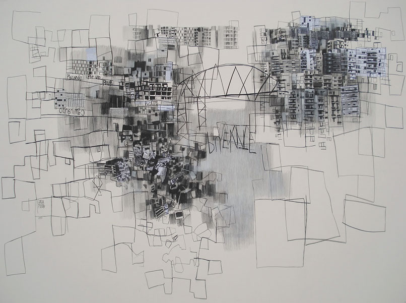 Paisaje despues de un puente, carbonilla pastel y collage sobre papel montado, 140 x 200 cm, 2009